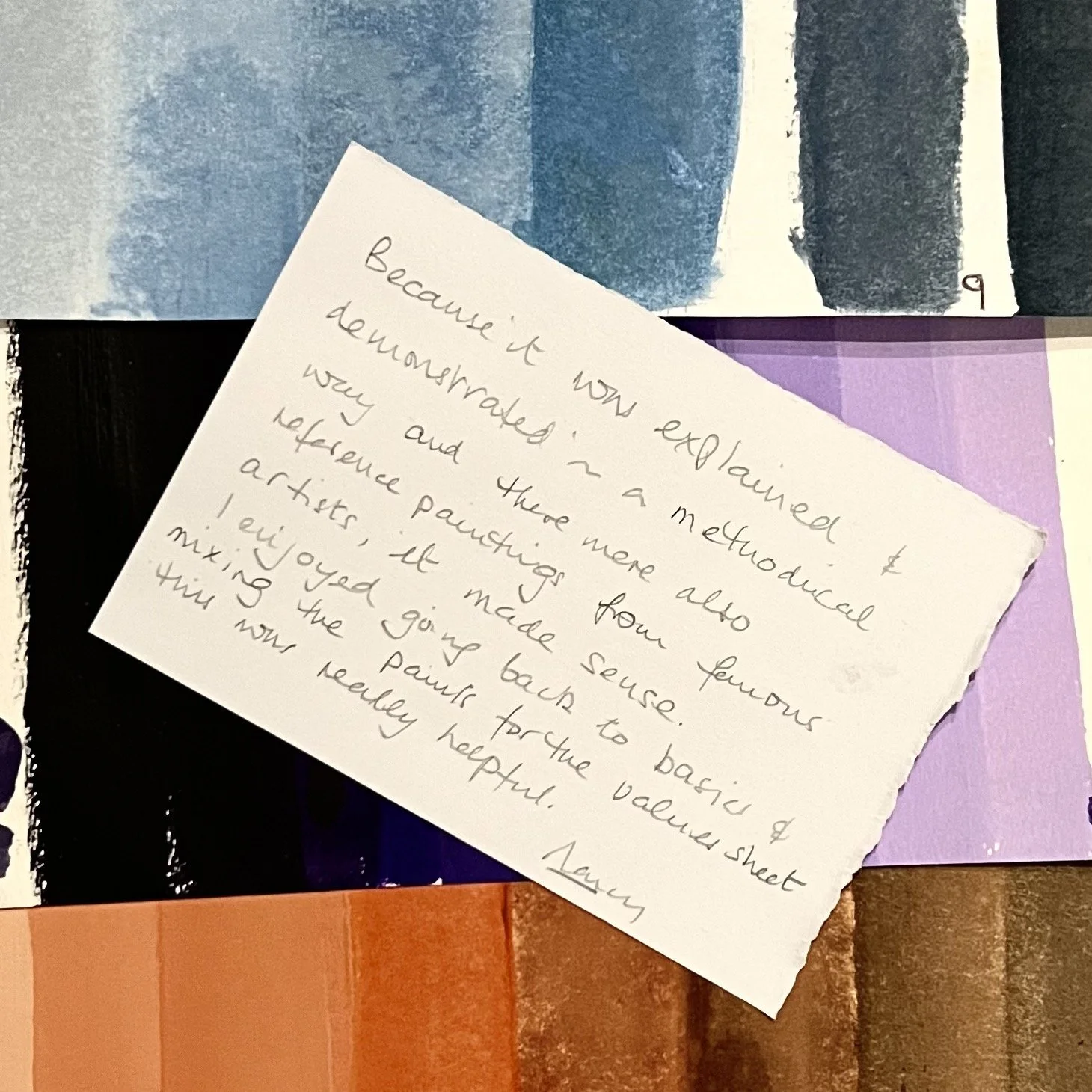 I taught a valuable lesson in VALUE (see what I did there!). ‘Value’ is one of the most important conditions in a painting, even more so than colour. If it’s right, the painting is alive, without value a painting will look flat. The value of a painting refers to how light or dark a colour is, or the relative lightness or darkness of a colour.