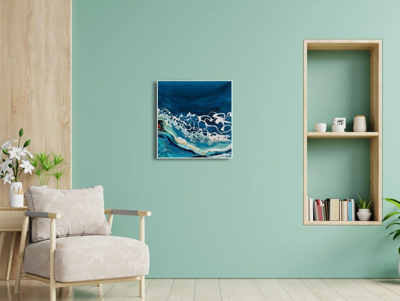 Inspired by the view from the plane when I travelled across the reef separating the North and South islands of New Zealand. This piece is framed.
