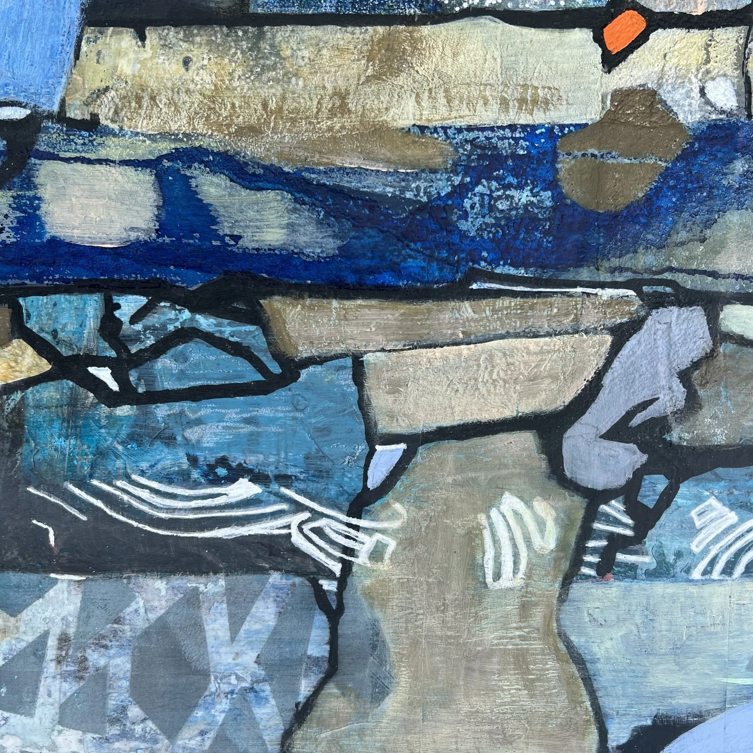 With these elements in mind I explore, using a variety of media and techniques . This piece is an exploration made in response to my observations of the patterns, textures and shapes that divide and dissect the jumble of rocks that create the incredibly dramatic cliffs at my local cove.